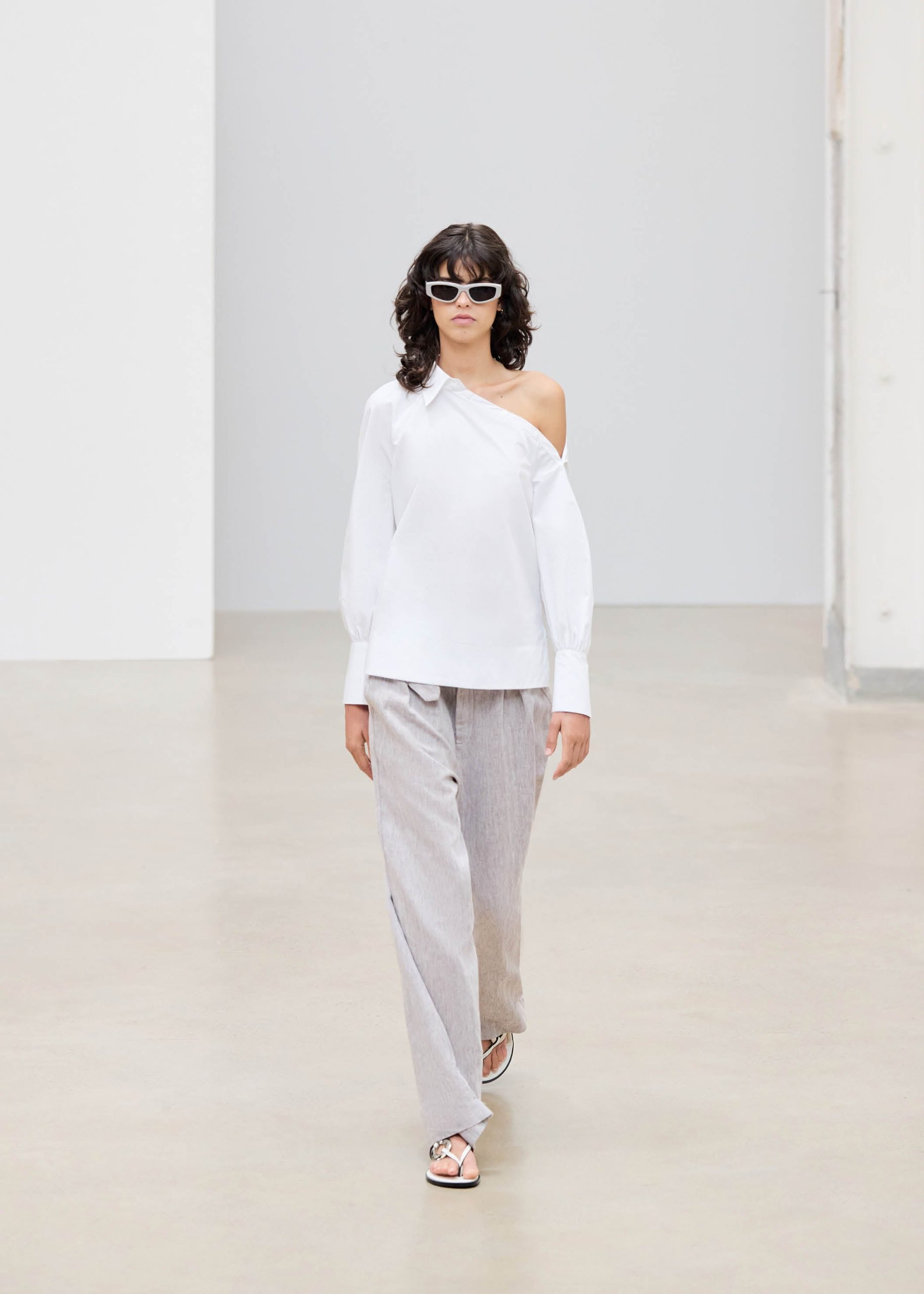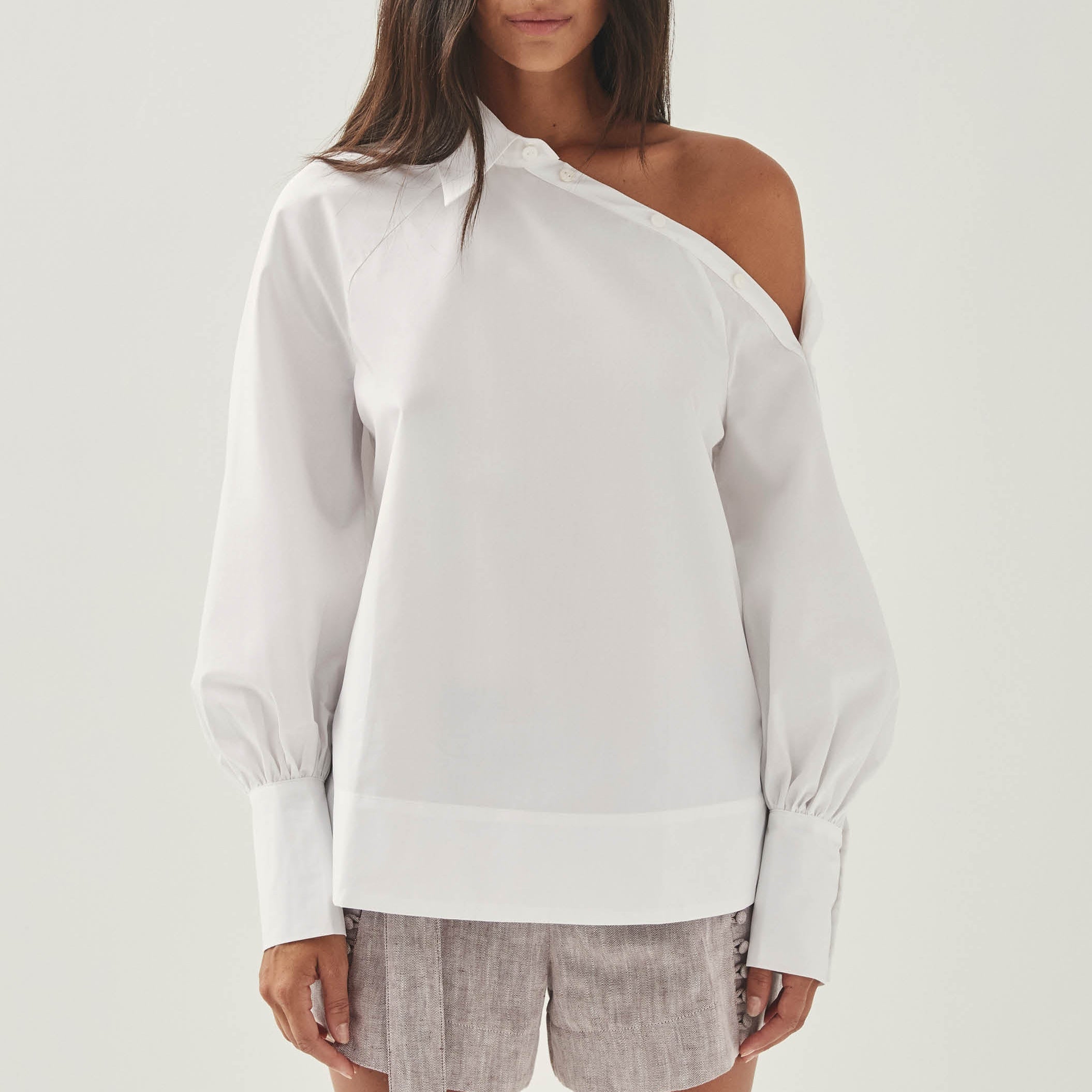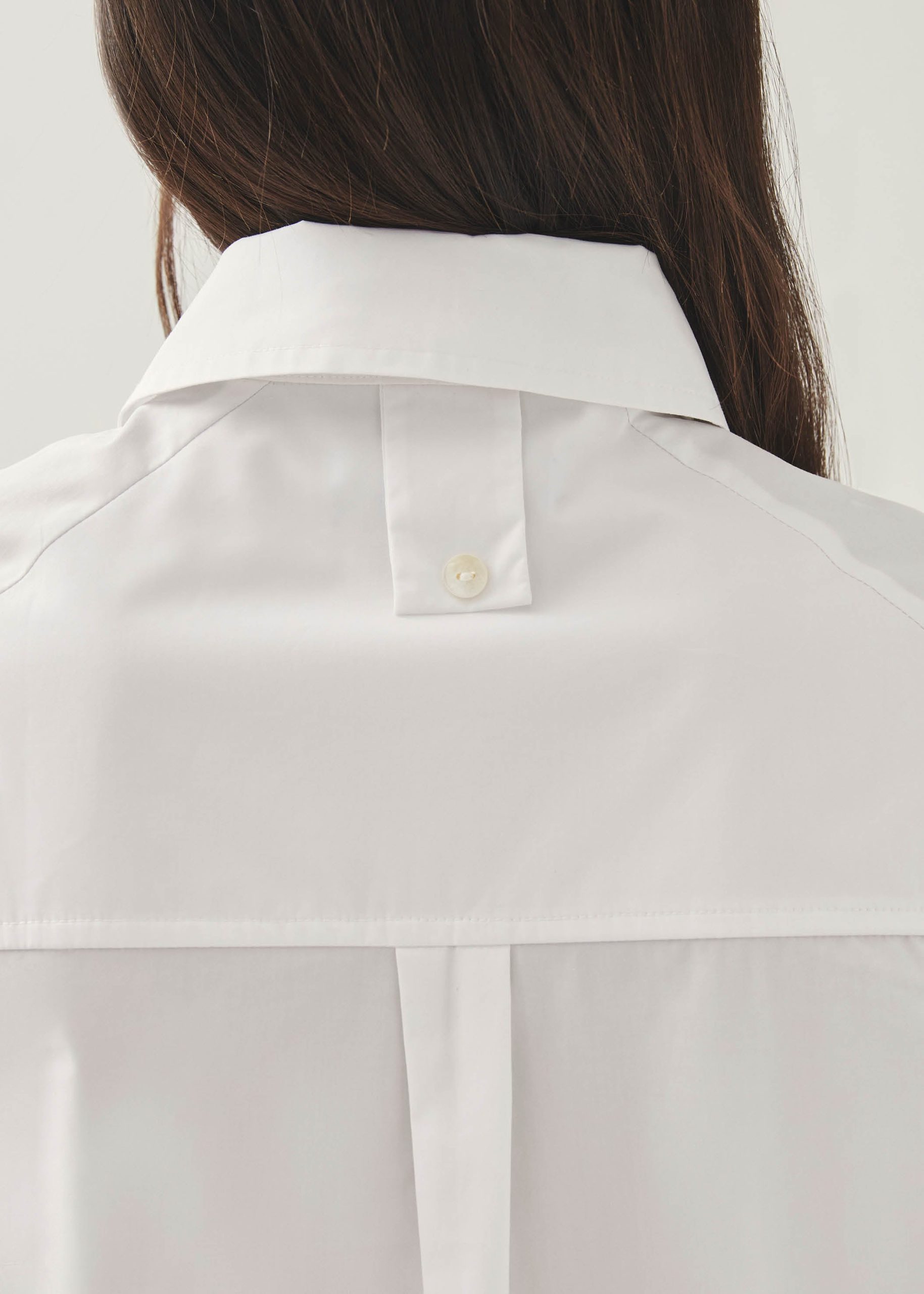 A classic. reinvented. Buttoned from the bottom of its puff sleeve to the neck. the Aiko white poplin shirt features a wide fit and a distinctive design. offering a fresh take on a timeless essential.